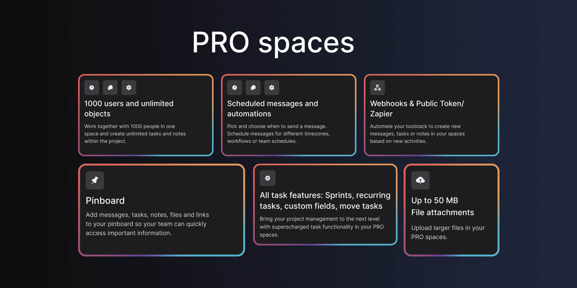 Redeem 20 credits to upgrade to the PRO starter plan when you’re on the free plan or already on a PRO starter plan. The plan includes up to 5 spaces, 2 PRO spaces and one workspace. To get more out of your task management, PRO spaces unlock: