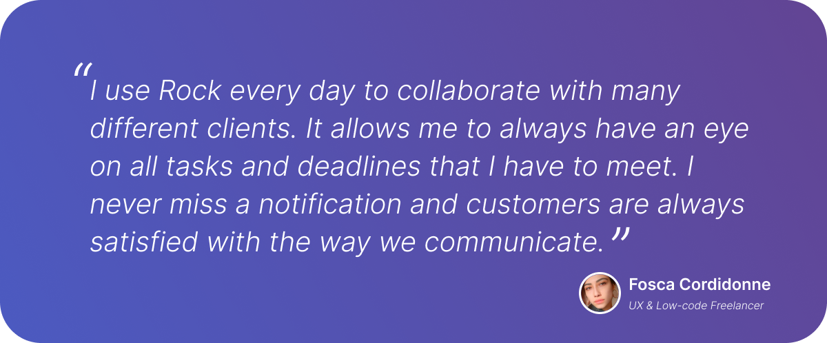 Fosca’s first-hand experience shows that freelancers can enhance their productivity and go headache-free by using the all-in-one approach on Rock. Bringing your clients to one platform saves time and allows you to focus on the results!