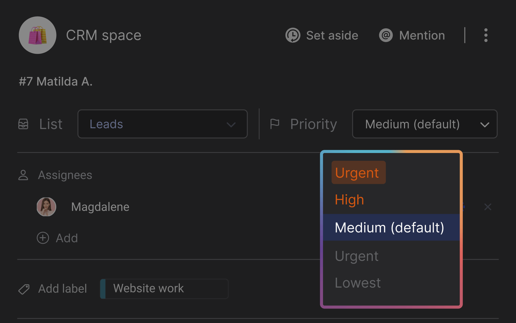 You can @ mention tasks from different spaces. For example, you want to save a task that you were working on in a space with a client. You can mention that task as a reference in a client task in your CRM space. It allows you to easily connect spaces and find information faster.
