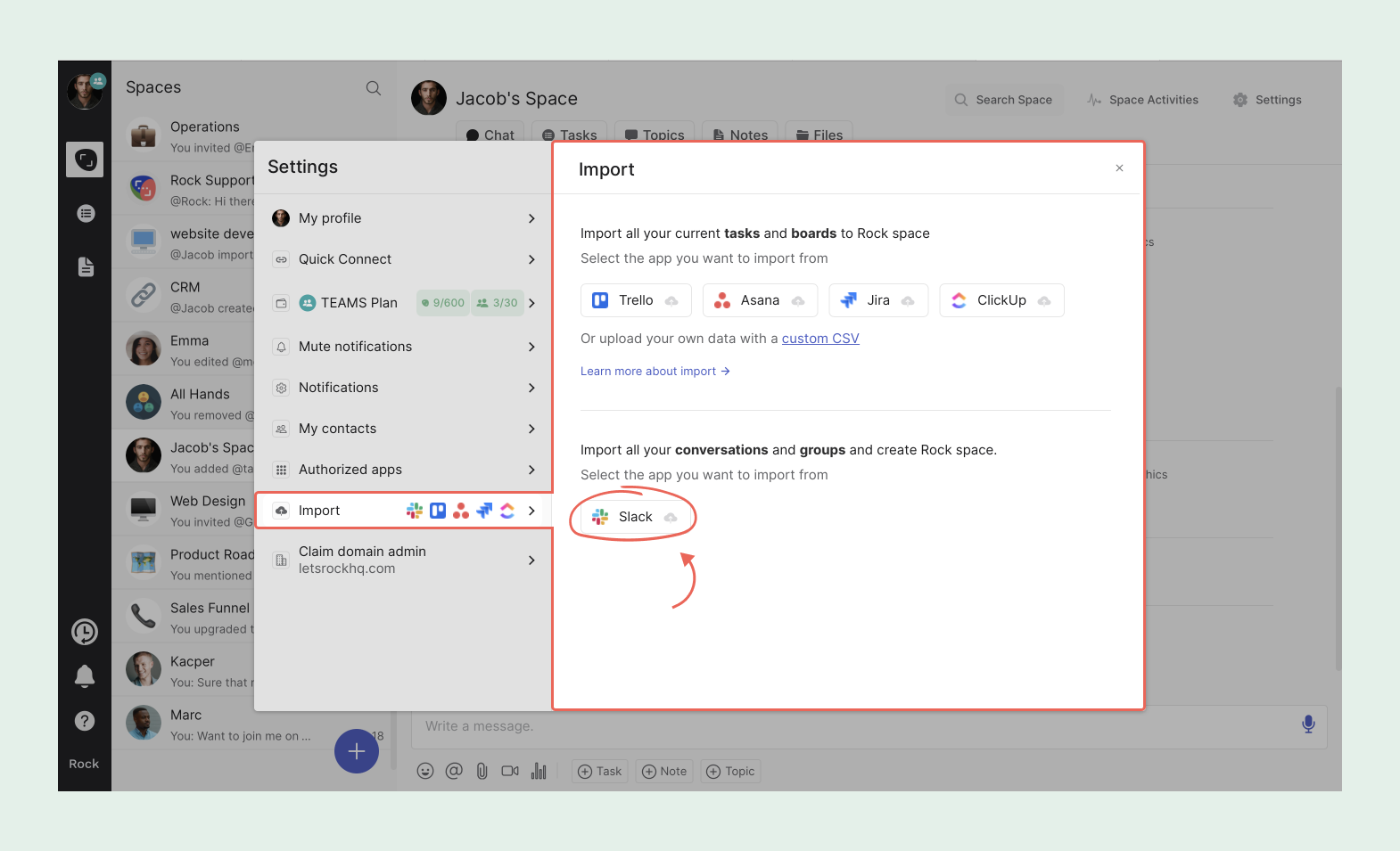 Rock directly imports all information into the different spaces for you. Additionally, imported messages are tagged with ‘message imported from Slack’ and automatically assigned to team members. Make sure that team members join with the same email address they have on Slack.
