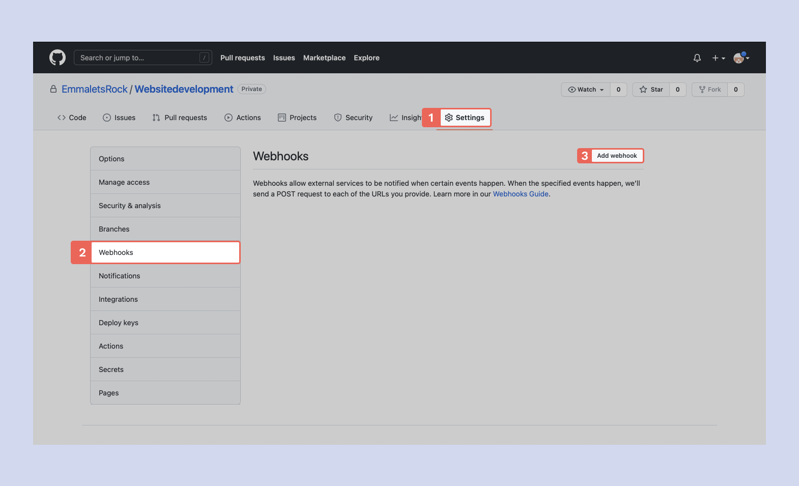 - Configure the following link to your account and repository after login: https://github.com/{team/user}/{repo}/settings/hooks/new for this help guide the user is named "EmmaletsRock" and the repository is "Websitedevelopment" making the link the following: https://github.com/EmmaletsRock/Websitedevelopment/settings/hooks/new