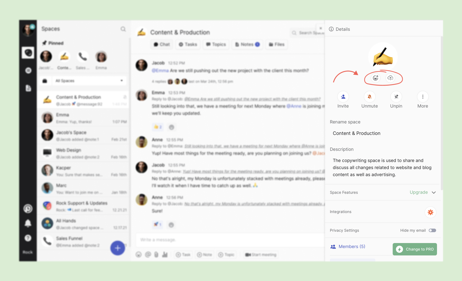 - Members can change the space name and image, and invite other members. They cannot remove users or add bots in integrations for PRO spaces.