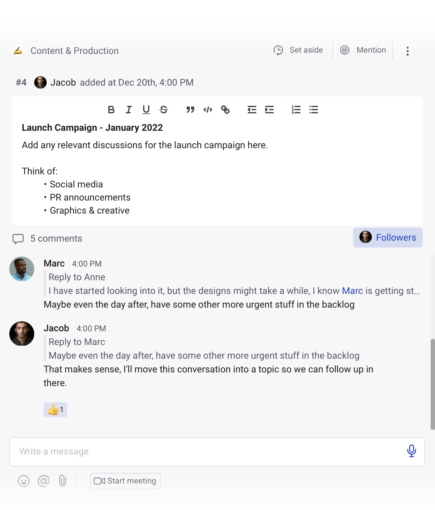 - Messages: Anyone in the space is welcome to join the discussion on a topic. In addition to all the functionality you typically find in comments, messages in topics also allow for threads, and audio messages.