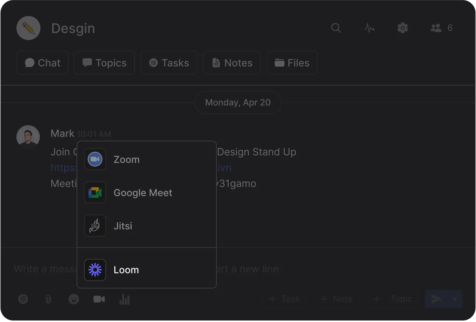 After integrating a videoconferencing provider you can send direct links for your meetings in the Chat mini-app. Everyone in your space will be notified with the invite and can jump directly into your meeting.